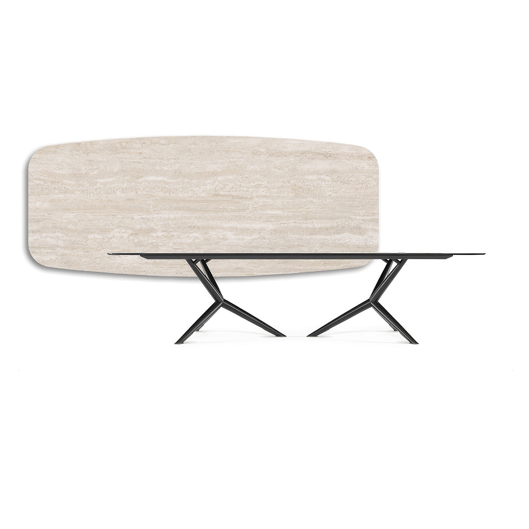 La mesa se asienta sobre una estructura esbelta en acero barnizado color negro que evoca un perfil escultórico: líneas limpias, proporciones equilibradas, presencia moderna. El sobre está fabricado en cerámica «Marmi» acabado Colosseo, una textura que recuerda mármoles clásicos con vetas sofisticadas y una superficie excepcionalmente resistente al uso cotidiano.