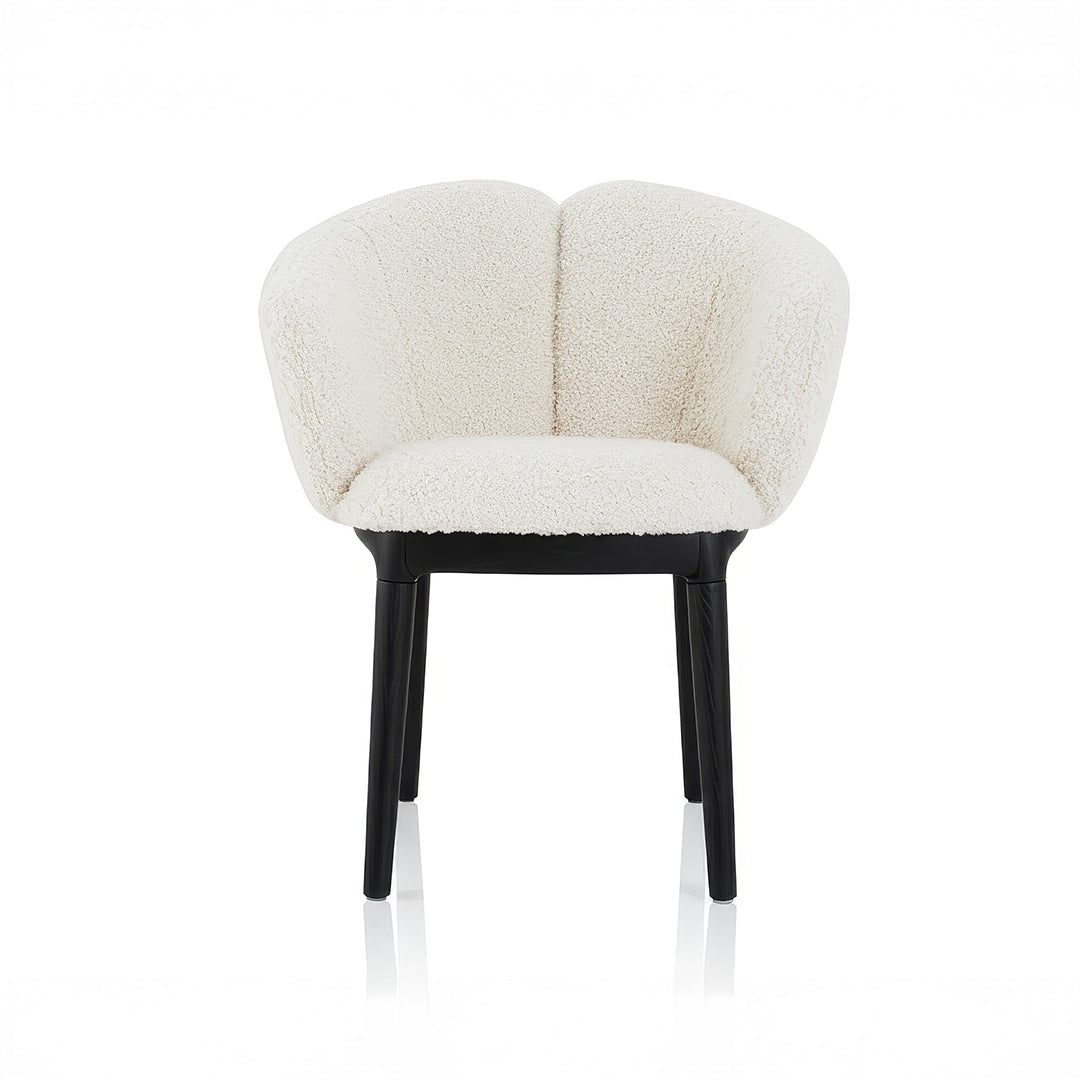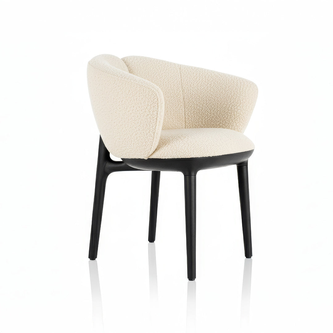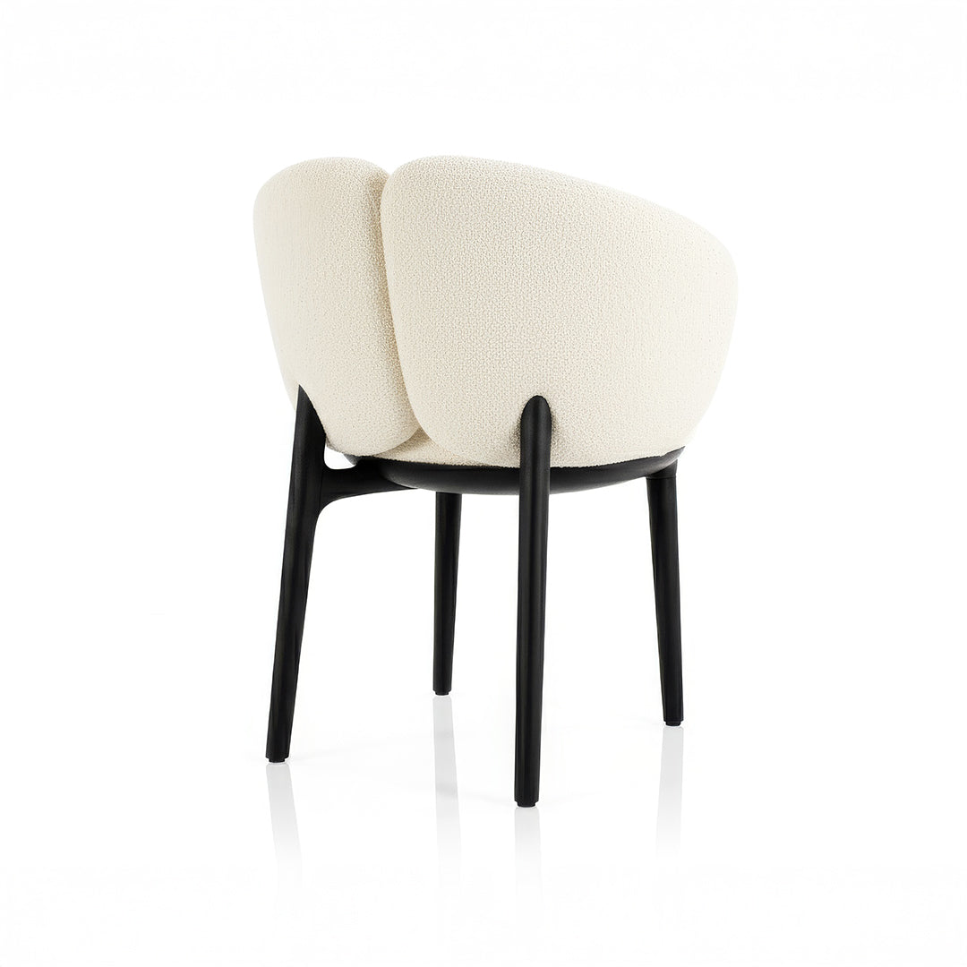 La estructura está fabricada en madera maciza que aporta solidez, presencia y un acabado premium. El asiento y respaldo tapizado en tela Bouclé.