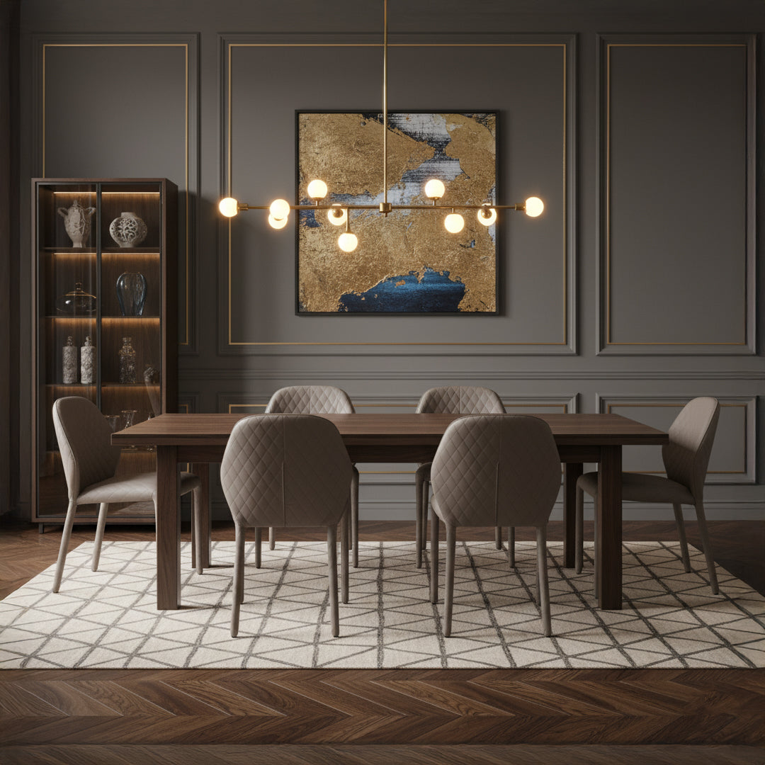Las dimensiones de la silla —52 cm de ancho, 52,2 cm de fondo y 87,3 cm de altura— logran un balance perfecto entre compacidad y elegancia. El asiento amplio y el respaldo acolchado ofrecen una postura cómoda durante largos periodos, ideal para comedores residenciales de diseño, espacios de hospitalidad premium o salas de reuniones exclusivas.