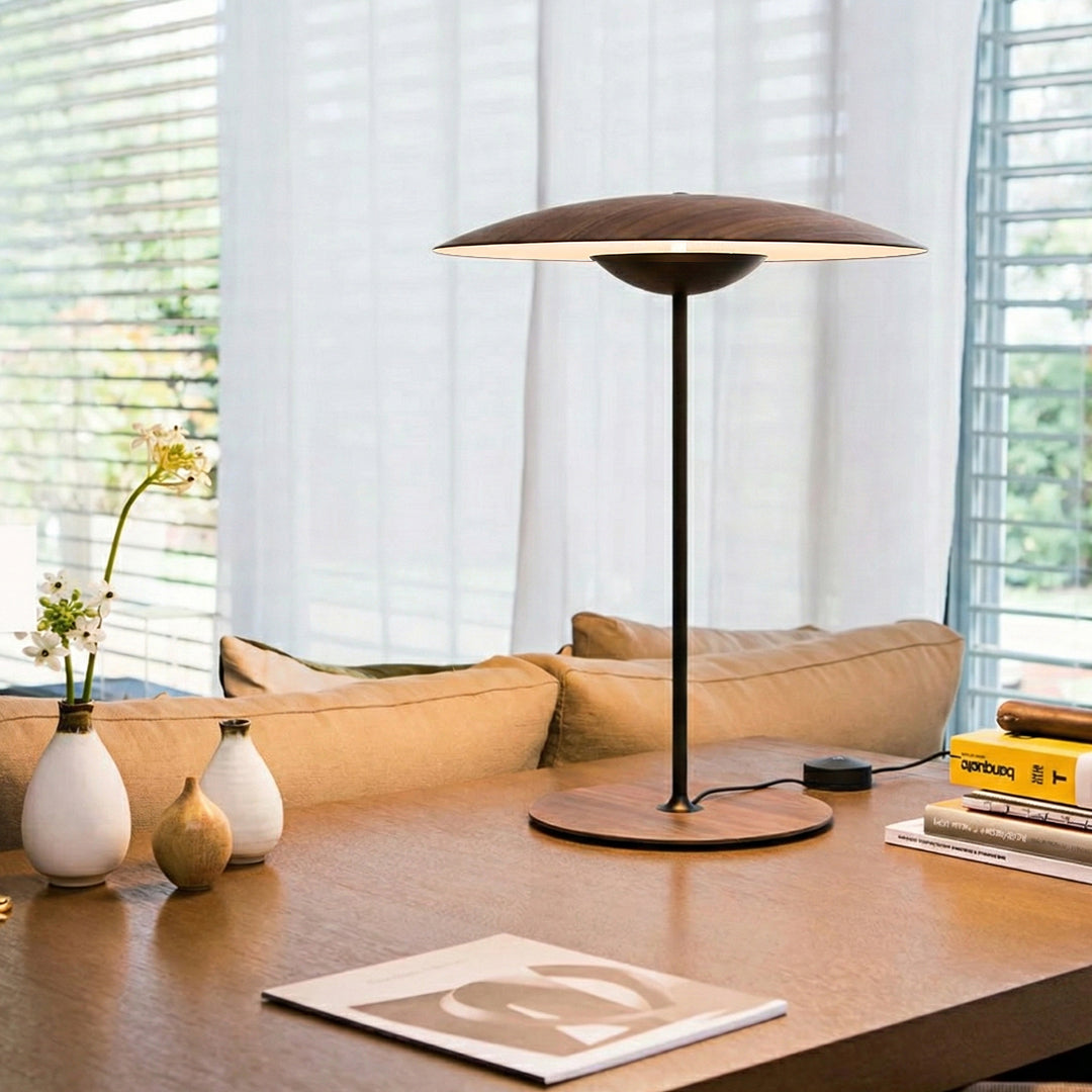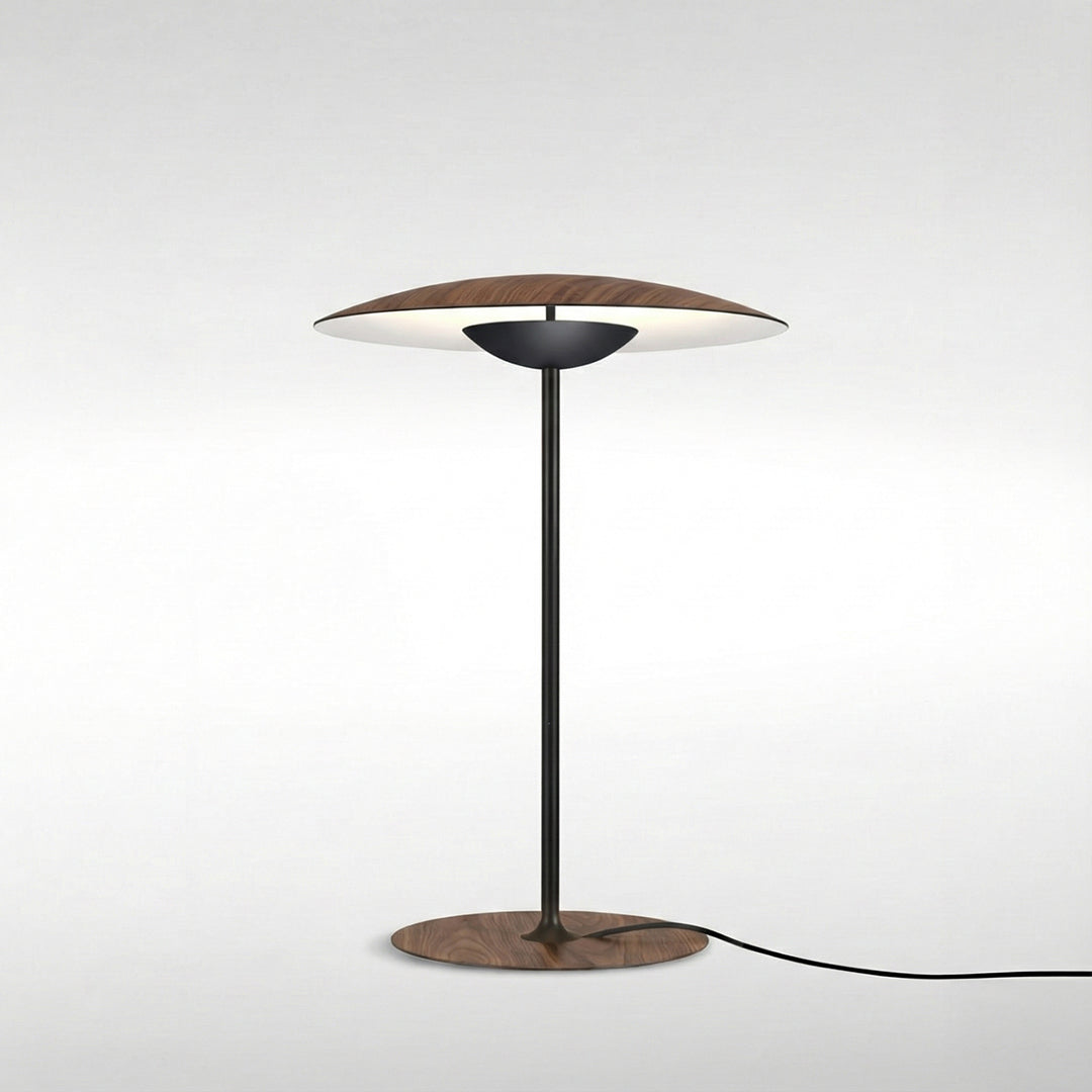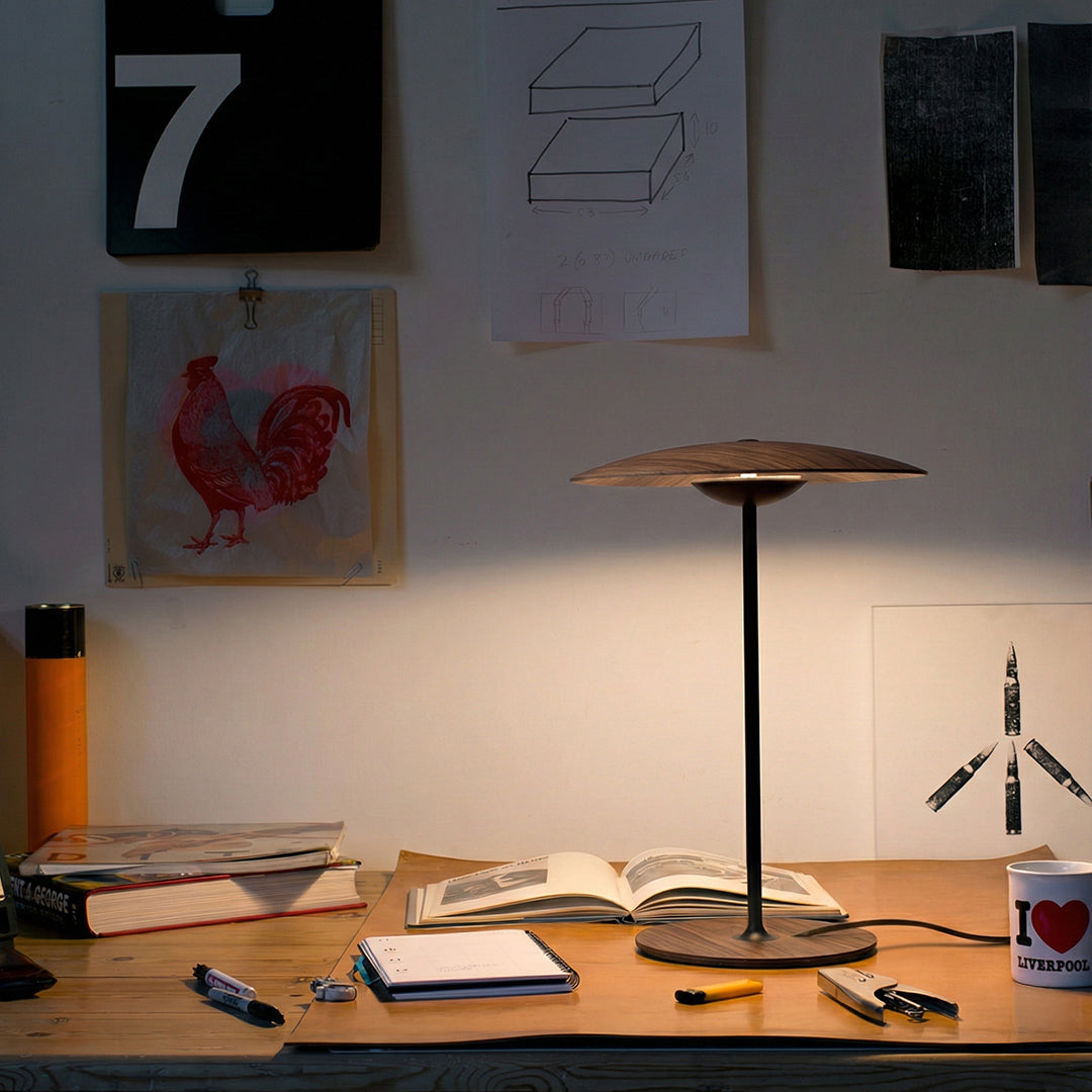 Originalmente la Ginger empieza siendo un diseño de madera, un gran aliado de la iluminación más intimista. La combinación de láminas de madera, papel y resinas prensadas a alta presión consigue una luminaria de aspecto casi plano, sobrio, que ilumina los espacios con luz directa por reflexión desde una presencia leve.
