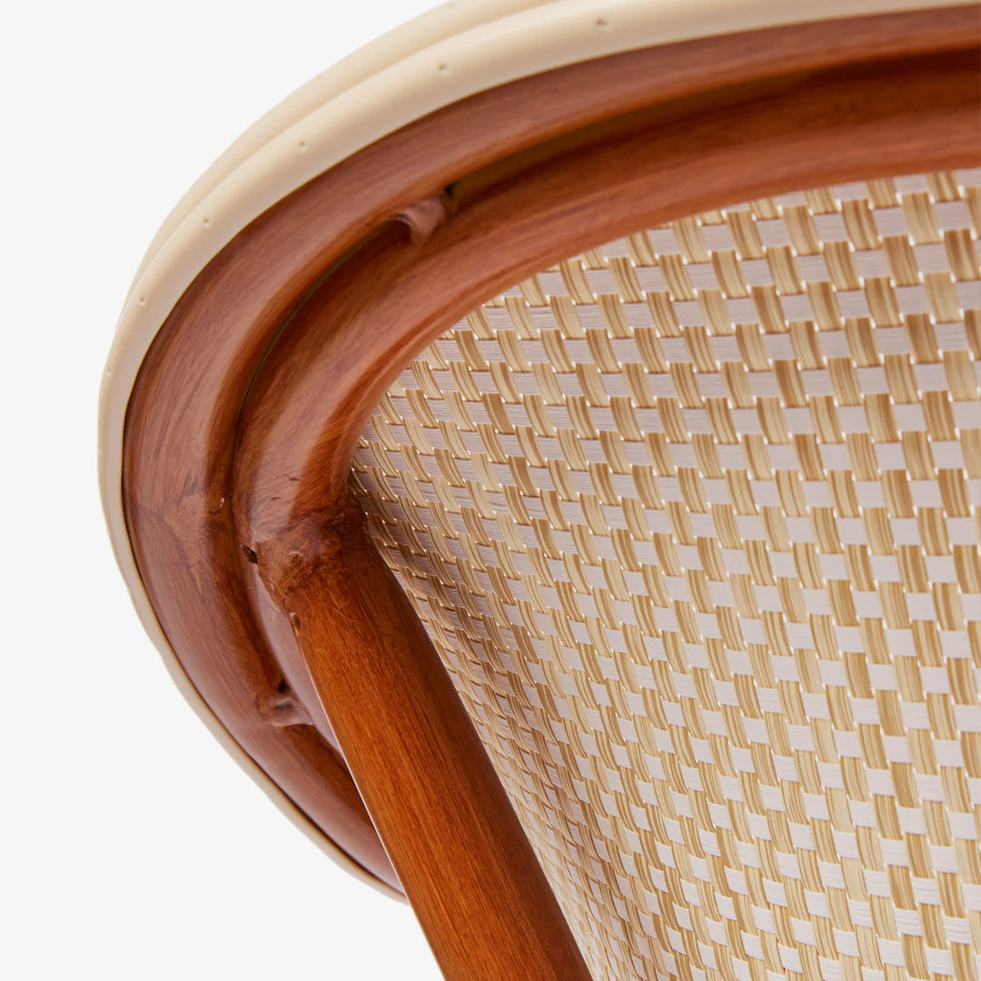 Cuenta con una estructura en aluminio pintado con pintura en polvo, ligera y altamente resistente a la intemperie, completamente reciclable. El asiento y respaldo están revestidos en Tessil Batyline, un tejido técnico reconocido por su excelente comportamiento en exteriores: es lavable, antimanchas, resistente a los rayos UV, antihongos y de secado rápido, garantizando un mantenimiento sencillo incluso en entornos de alto tránsito.