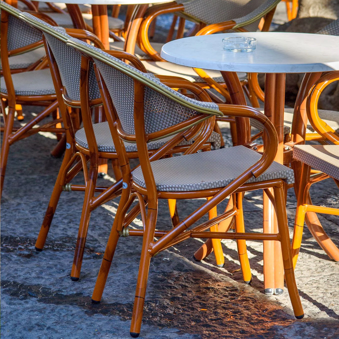 Terrazas gastronómicas, restaurantes, cafés, hoteles y espacios hospitality que requieren una silla con brazos resistente, ligera y diseñada para un uso intensivo en exteriores.