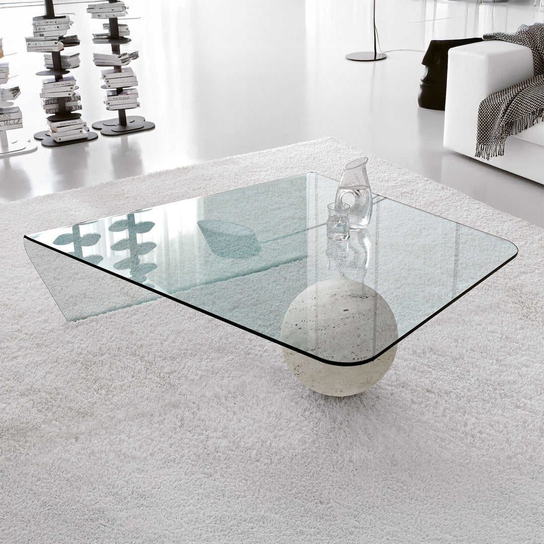 Globe se realiza de vidrio curvado, con sobre de apoyo de forma irregular y esquinas aclaflanadas. Presenta dos apoyos en el suelo, uno de vidrio, que forma una unidad con el sobre curvo transparente, y el otro constituido por una esfera en el característico mármol Italiano Travertino, un globo, tal como el nombre lo sugiere. Esta mesa de vidrio para sala de estar es una propuesta de estilo original pero, al mismo tiempo, refinada, gracias a los materiales elaborados con maestría.