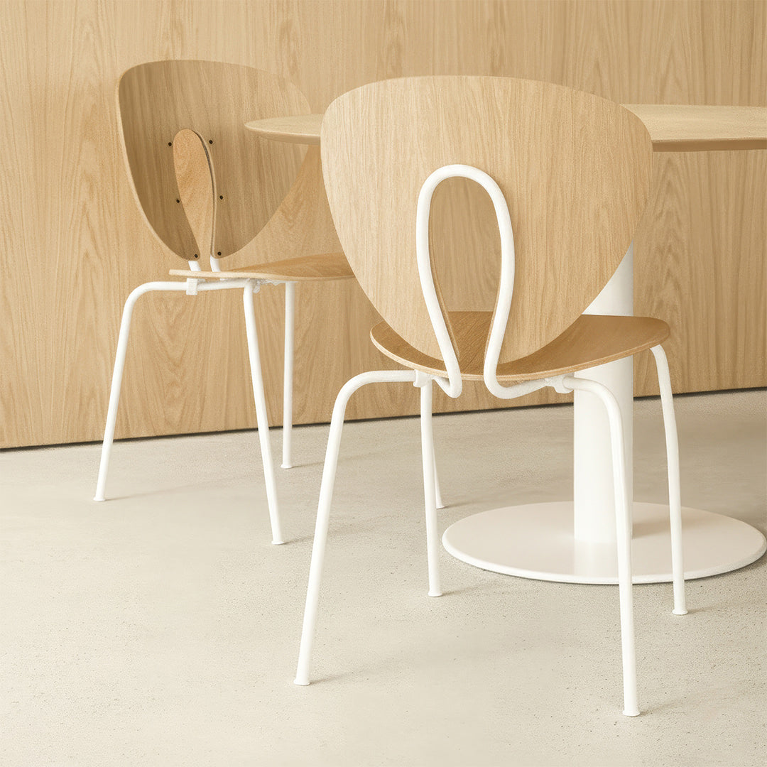 Acabado: asiento y respaldo en madera de roble / estructura metálica blanca