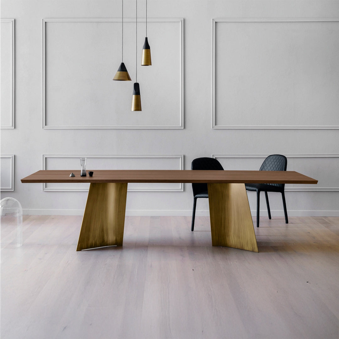 Su formato de 240 × 100 cm con altura de 75 cm convierte a Maggese en una mesa de dimensiones amplias, perfectamente adecuada para comedores de alto perfil. La elección del nogal y la estructura metálica oxibras dialogan entre lo orgánico y lo geométrico, permitiendo que la mesa actúe tanto como eje funcional como elemento decorativo.