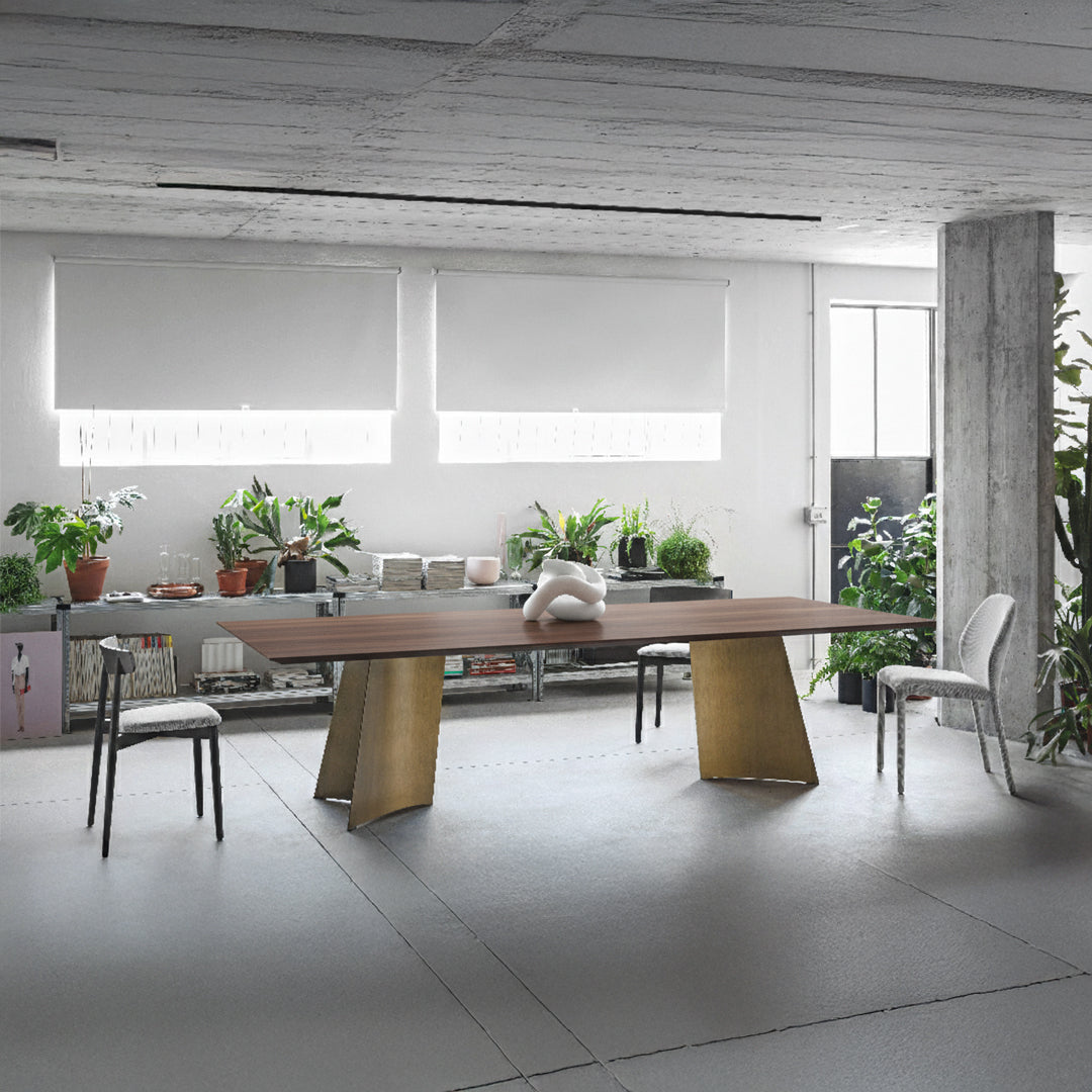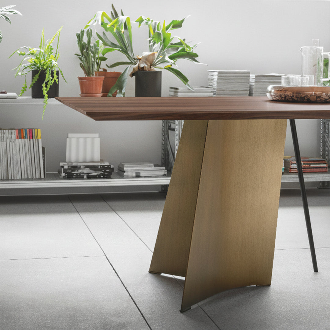 La mesa Maggese, diseñada por Paolo Cappello para Miniforms, se presenta como una pieza que conjuga presencia escultural y ligereza visual. Apoyada sobre una base metálica con tratamiento oxibras que evoca un sutil matiz envejecido-industrial, su tapa en madera nogal aporta calidez, tacto natural y sofisticación al espacio.