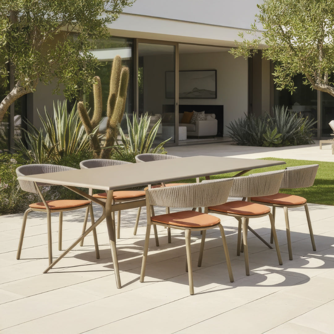 Su estructura de aluminio pintado, disponible en una amplia gama de colores, se combina armoniosamente con un tablero de gres porcelánico de 10 mm de espesor, ofreciendo durabilidad y sofisticación. Disponible en dos tamaños, 220x100x75 cm, y 290x100x75 cm la mesa Moai se adapta a diversas necesidades y estilos de decoración.