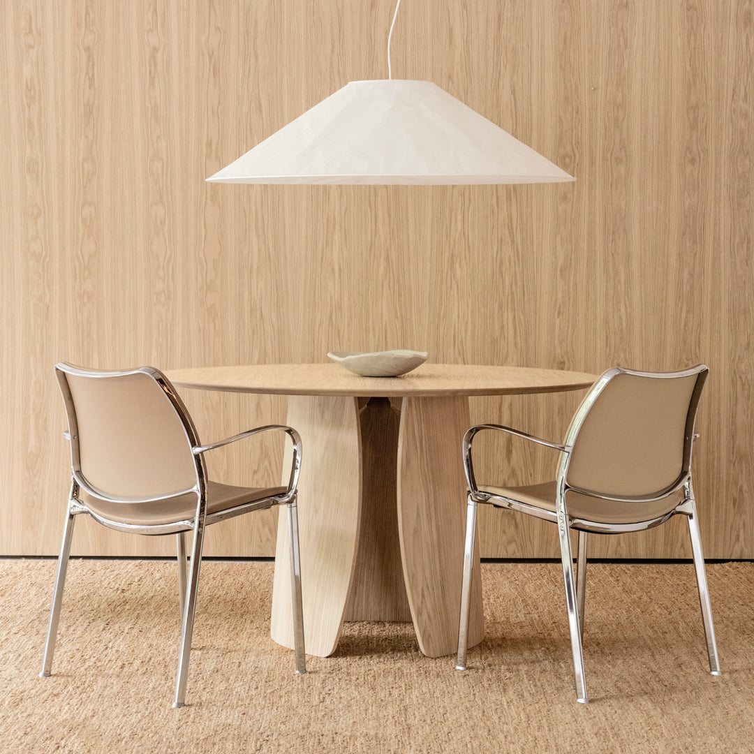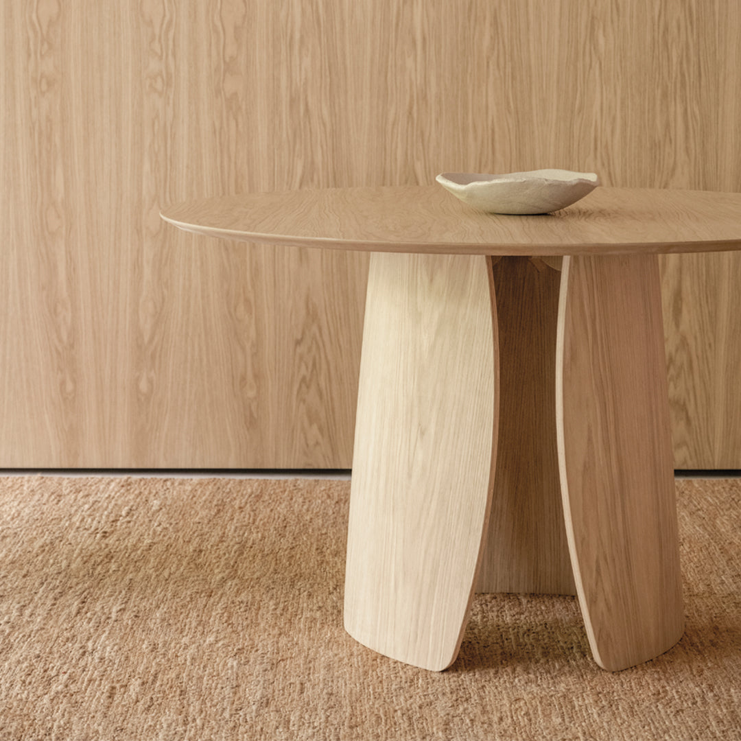 Diseñada con sutileza y presencia, la mesa Petal celebra la calidez de la madera y la elegancia del trazo curvo. Su formato redondo de 120 cm de diámetro ofrece una solución refinada para espacios residenciales y contract de nivel premium, ideal para entrevistas, reuniones creativas o cenas íntimas.