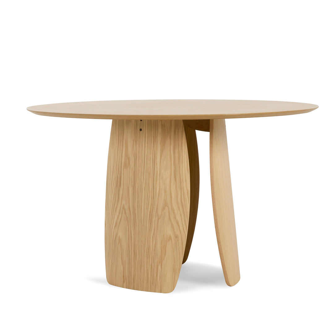 La versión en roble natural está compuesta por un sobre fabricado en MDF recubierto con chapa de roble y acabado interior con protección acrílica, lo que garantiza durabilidad y fácil mantenimiento.  Las patas están realizadas en contrachapado de roble proveniente de bosques franceses gestionados de manera sostenible.  Gracias al tratamiento y diseño, la mesa conserva la riqueza natural de la veta del roble entregando textura, calidez y carácter.