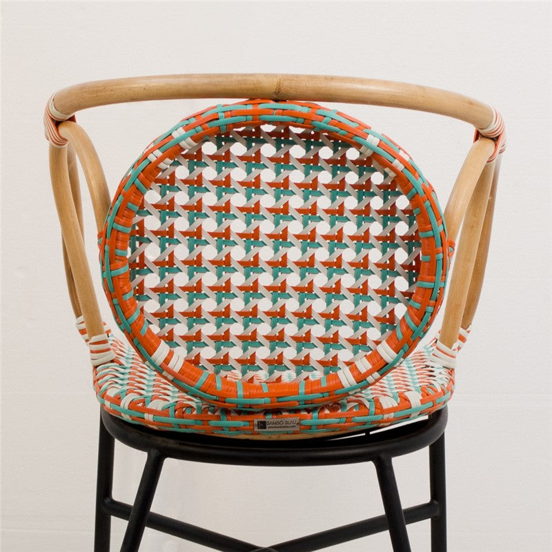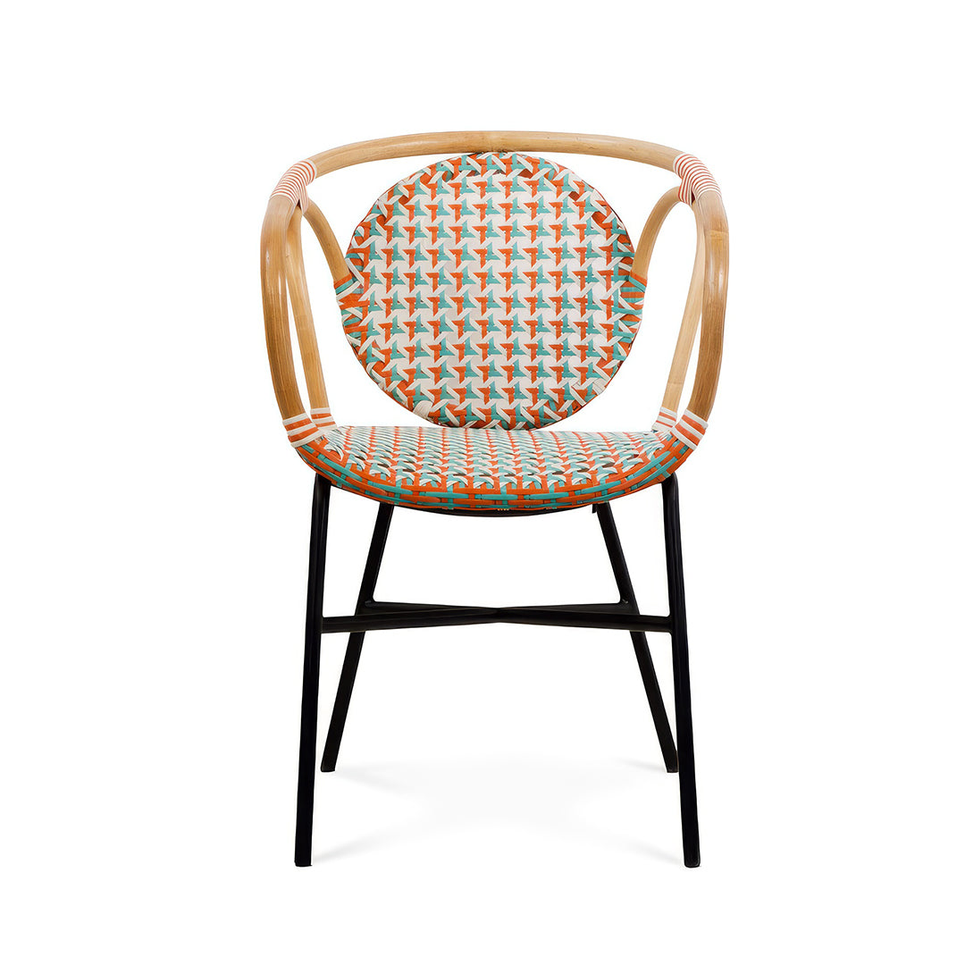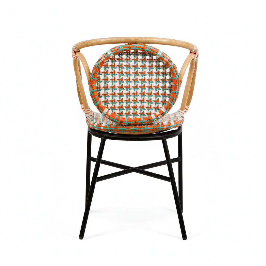 Su diseño envolvente y proporciones cuidadosamente estudiadas ofrecen una experiencia de asiento cómoda y estable, ideal para restaurantes, cafés y hoteles que buscan diferenciarse con un mobiliario de personalidad propia. La estructura de hierro aporta firmeza y durabilidad, mientras que el ratán trabajado a mano introduce textura, ligereza visual y un aire sofisticado que eleva cualquier ambiente.