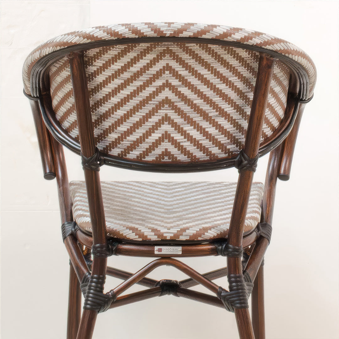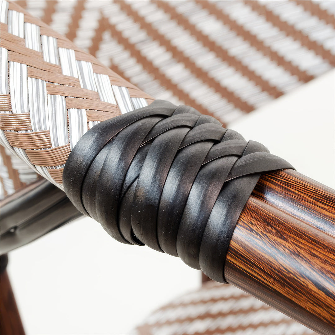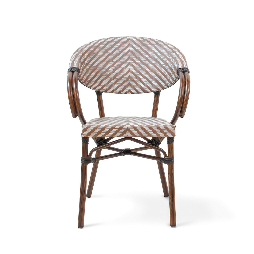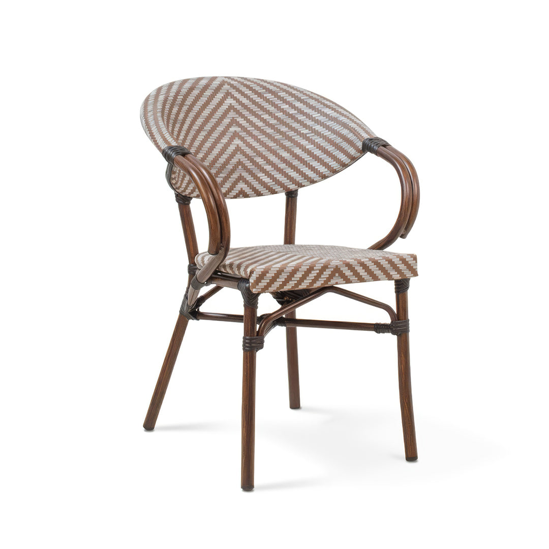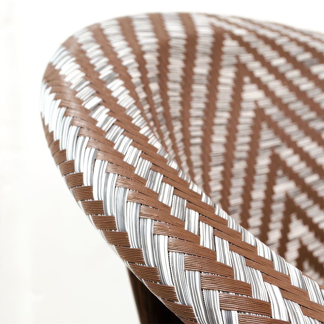 Su estructura en aluminio garantiza alta resistencia a la corrosión y al desgaste diario, mientras que el asiento y respaldo en textil con tejido tipo espiga aportan confort, ventilación y una imagen sofisticada que se adapta tanto a interiores como a exteriores cubiertos.
