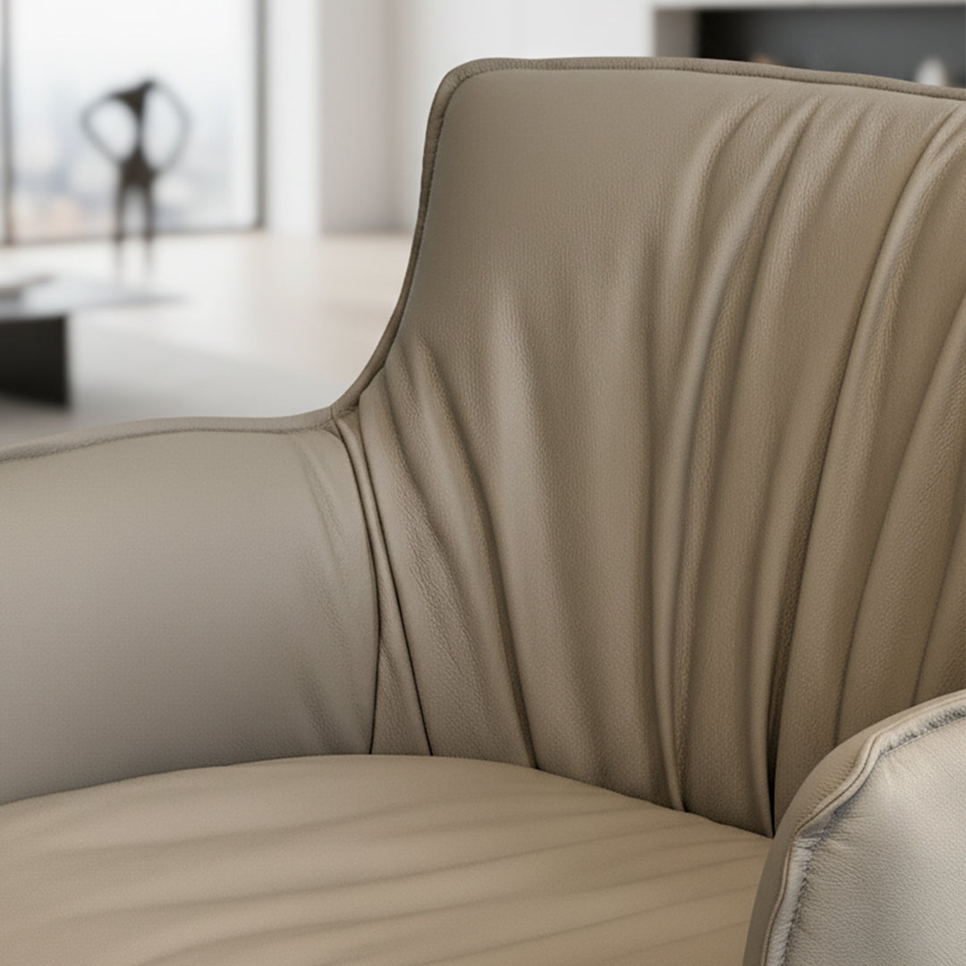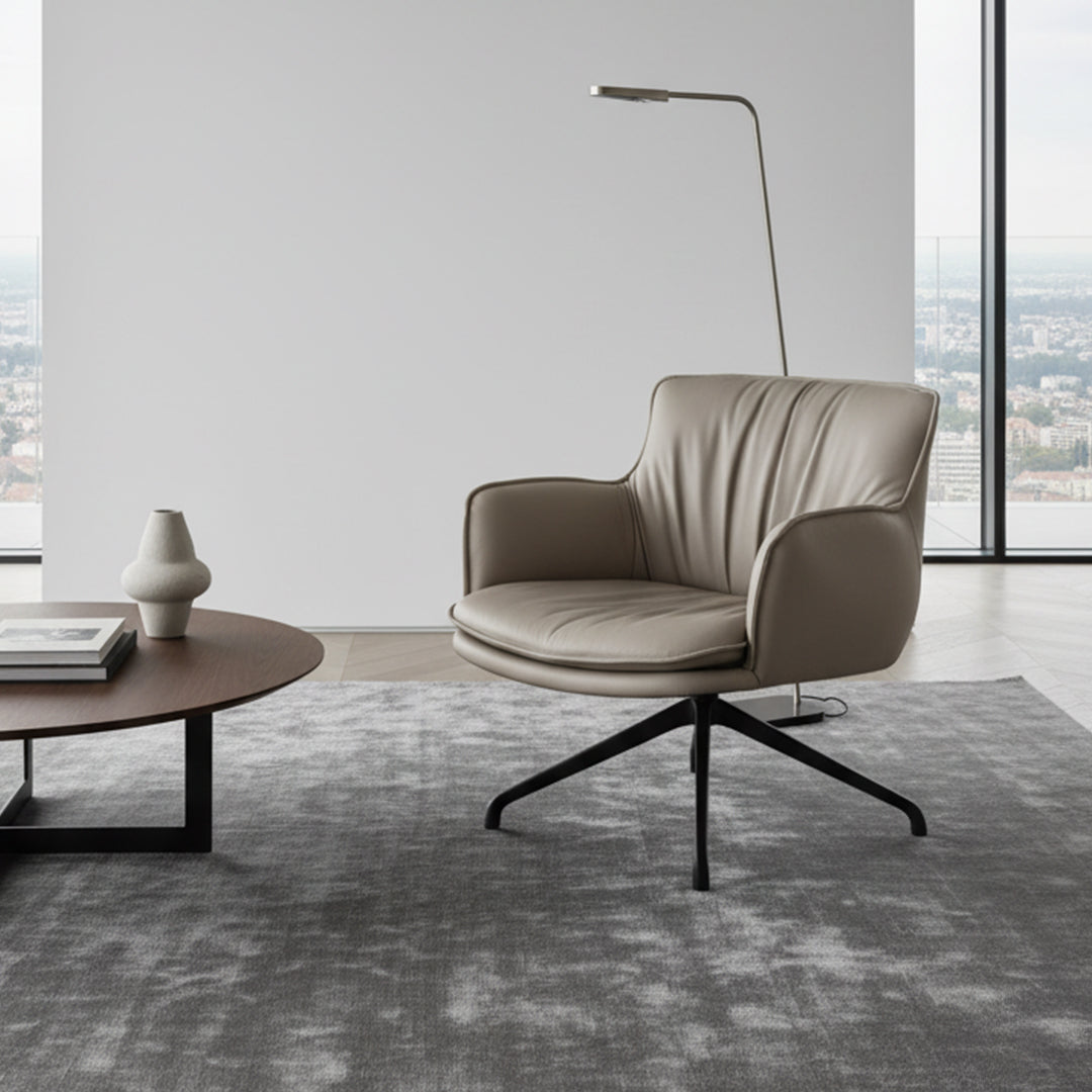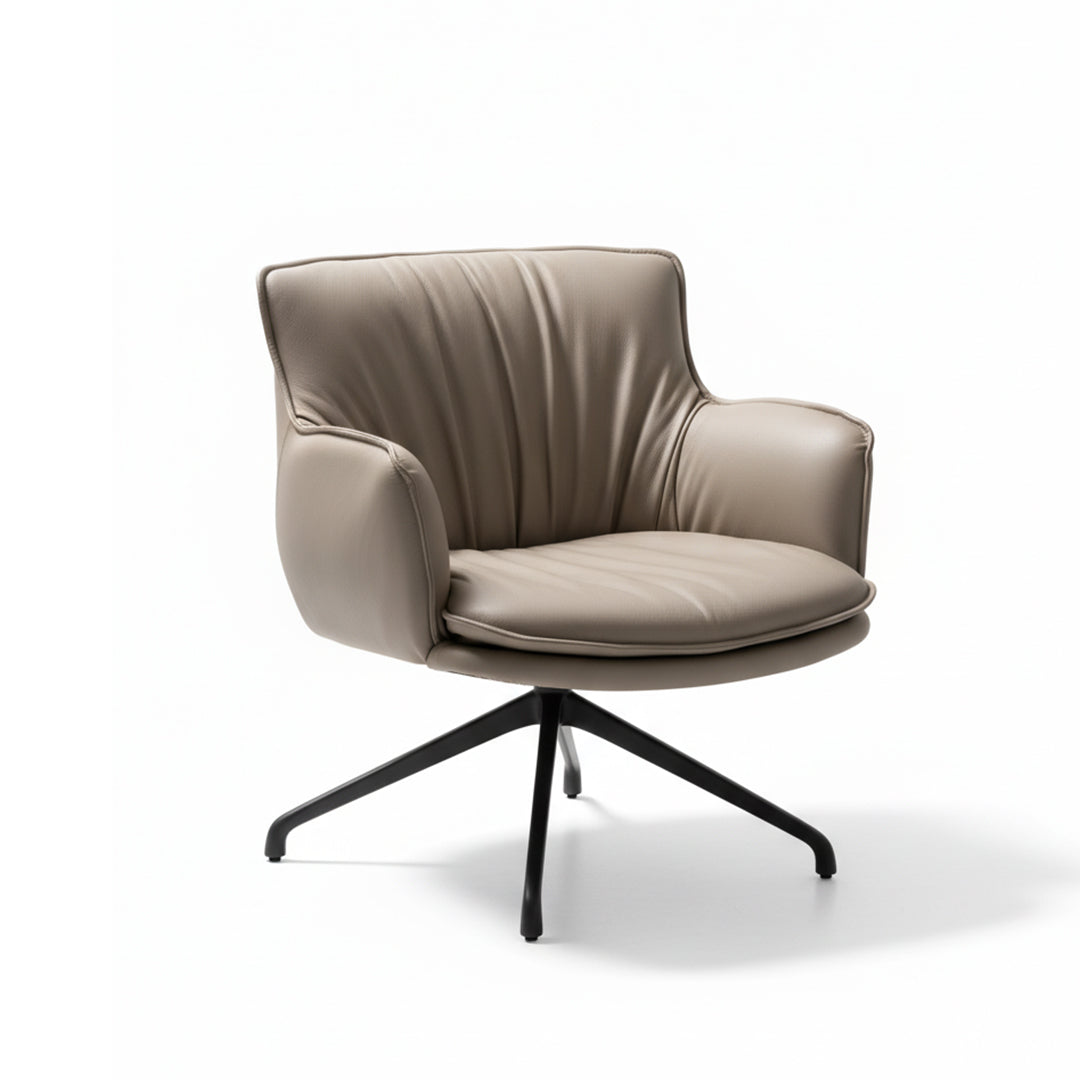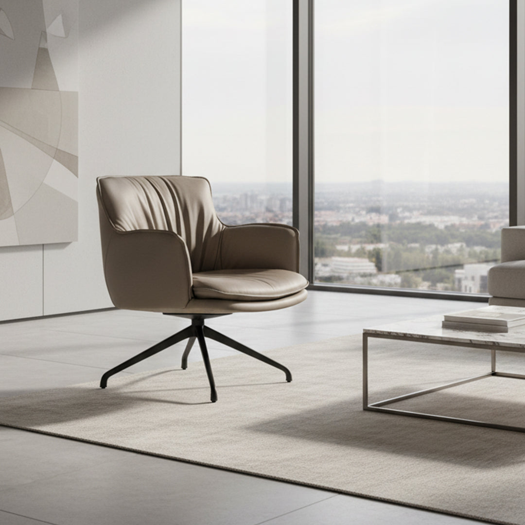 Para completar el ambiente con uniformidad, se pueden asociar los taburetes de barra de diseño: Rhonda Sgabello. Como el resto de la familia de asientos personalizables, la estructura de metal se encuentra disponible en diferentes alturas y variantes de forma, con tonos que se combinan con las elegantes pieles y telas que se encuentran en el muestrario.Enfin, le fauteuil tournante moderne Rhonda Lounge complète la famille avec son assise large et arrondie et sa base pivotante qui rationalisent sa silhouette généreuse.