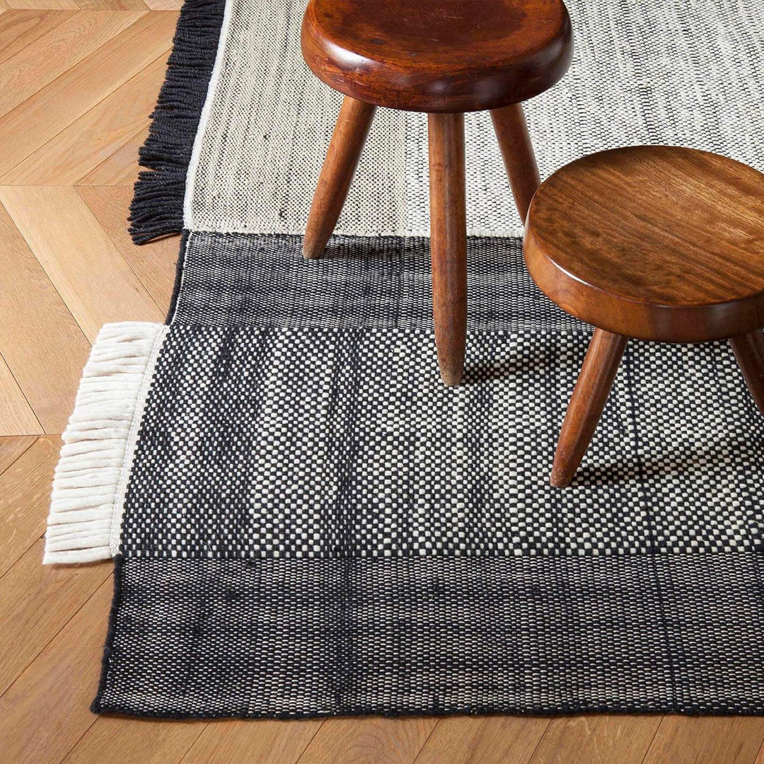 Tres es una alfombra tradicional india de tejido plano Dhurrie. Su cualidad única reside en la elaboración de tres partes independientes en las que predominan fibras diferentes. La proporción y la combinación de lana, fieltro y algodón generan cambios de tono e irregularidades en el tejido, dando vida al patrón.